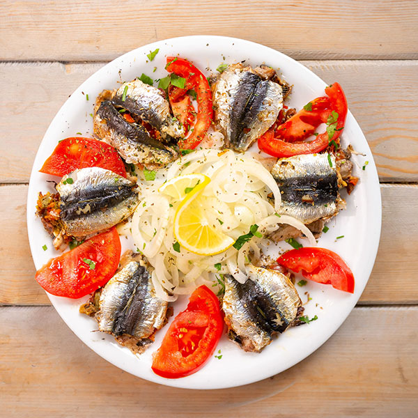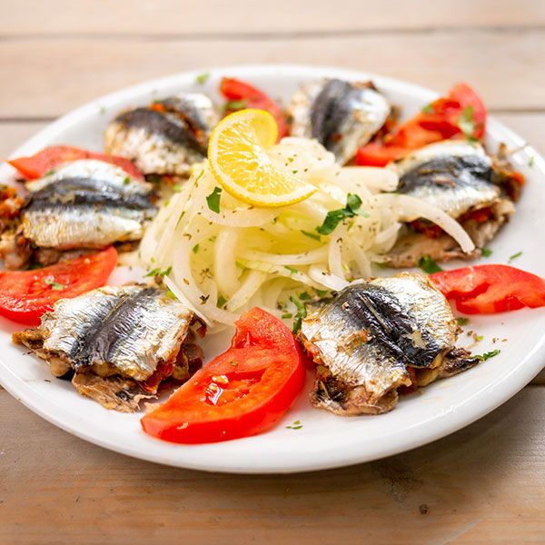 Φρέσκες σαρδέλες φιλεταρισμένες, με βελούδινη γέμιση από μείγμα ελαιολάδου, τομάτας, σκόρδου ρίγανης και κάπαρης, ψημένες στη σχάρα.
